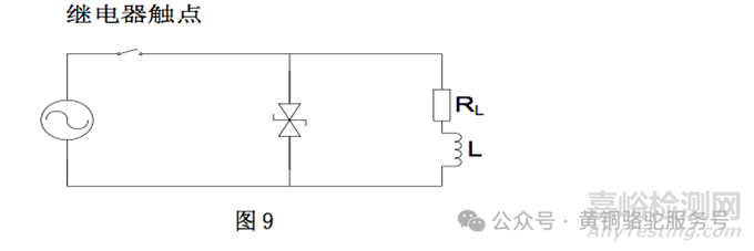 解決的方法是在電感負載的兩端并連箝位二極管或電容器與電阻串連支路。如繼電器觸點電弧抑制,為了避免損壞觸點,必須采用一種電弧抑制方法。對于直流負載,可以采用圖7所示單個二極管,此二極管必須能通過一等于額定負載的電流,反向電壓額定值必須高于電路的電源電壓。對于交流電路,可采用圖8、圖9的方法。