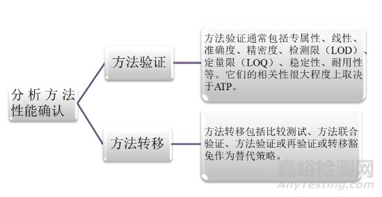 其次是第二階段:分析方法性能確認(rèn)。主要包括方法驗(yàn)證和方法轉(zhuǎn)移兩個部分。方法驗(yàn)證的目的是確認(rèn)該方法將按預(yù)期運(yùn)行,并且能滿足先前定義的ATP的標(biāo)準(zhǔn)。而方法轉(zhuǎn)移則是因?yàn)樵诋a(chǎn)品從開發(fā)、擴(kuò)大、制造、生產(chǎn)和投產(chǎn)到批準(zhǔn)后的生命周期中,要滿足將分析方法從研發(fā)實(shí)驗(yàn)室轉(zhuǎn)移到生產(chǎn)實(shí)驗(yàn)室的要求。方法轉(zhuǎn)移過程中,應(yīng)當(dāng)進(jìn)行嚴(yán)謹(jǐn)?shù)娘L(fēng)險評估,來確定需要進(jìn)行對比的參數(shù)。2020年版《中國藥典》四部指導(dǎo)原則9099[5]、9101[6]和9100[7]分別對分析方法的確認(rèn)、驗(yàn)證和轉(zhuǎn)移進(jìn)行了詳細(xì)的描述。