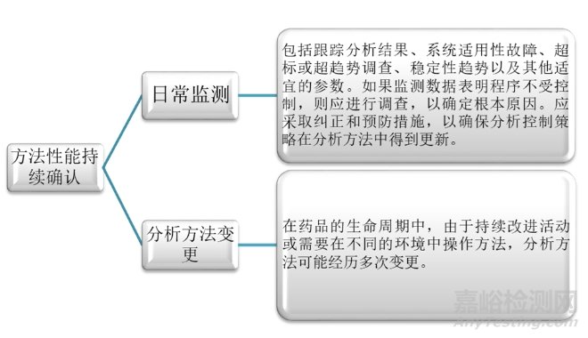 再次是第三階段:持續(xù)方法性能確認(rèn)。此階段是分析方法生命周期中確保分析方法保持在受控狀態(tài),持續(xù)滿足ATP標(biāo)準(zhǔn)的重要方面。主要包括日常監(jiān)測和分析方法變更兩個組成部分。因此,此階段在ATP中被用作程序性能的參考點(diǎn)。