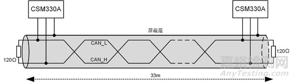 經(jīng)過(guò)我們實(shí)際測(cè)試我司的 CSM330A 的收發(fā)器和隔離延時(shí)t2=140ns,控制器延時(shí)t1=50ns,CSM330A在1M CAN波特率采樣位置為75%*1us=750ns,實(shí)測(cè)RVSP通信線纜每米延時(shí)Cable delay=5.5ns。將數(shù)值帶入上述關(guān)系式中得出CSM330A 在1M波特率下通信線長(zhǎng)滿足L線長(zhǎng)≤33.6m。