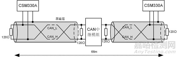 視頻中有延長(zhǎng)通信距離方案,本文做簡(jiǎn)要概述。如圖4所示為1M CAN協(xié)議傳輸距離簡(jiǎn)圖,接入1個(gè)用CSM330A方案搭建的CAN_Repeater,通信距離可延長(zhǎng)至66m如圖5所示,接入n個(gè)CAN_Repeater后通信距離可延長(zhǎng)至(n+1)*33m。