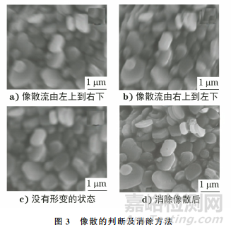 在高倍率下拍攝圖像時(shí),像散的判斷及消除非常重要,像散是由透鏡磁場(chǎng)非旋轉(zhuǎn)對(duì)稱(chēng)引起的一種像差,就如同散光一樣(見(jiàn)圖3),在聚焦過(guò)程中本應(yīng)呈圓形的圖像變成橢圓,這樣圖像就不再完美對(duì)稱(chēng)。像散是影響圖像清晰度的重要因素,會(huì)嚴(yán)重影響電鏡的圖像質(zhì)量。