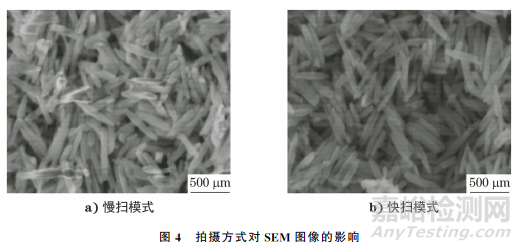 在拍攝過(guò)程中,不同的拍攝方式也會(huì)影響拍攝效果,對(duì)于導(dǎo)電效果不佳的納米顆粒試樣,拍照過(guò)程中,如果采取慢掃模式會(huì)出現(xiàn)荷電效應(yīng),照片中會(huì)出現(xiàn)磨平現(xiàn)象,荷電效應(yīng)是影響掃描電鏡圖像質(zhì)量的重要原因,它會(huì)使圖像異常變亮、畸變,產(chǎn)生像散,出現(xiàn)圖像模糊、亮線等現(xiàn)象。此時(shí)可以在快掃模式下采用多幅圖像的疊加或多幀圖像的積分方式,避免出現(xiàn)磨平現(xiàn)象,獲得良好的拍攝效果(見(jiàn)圖4)。