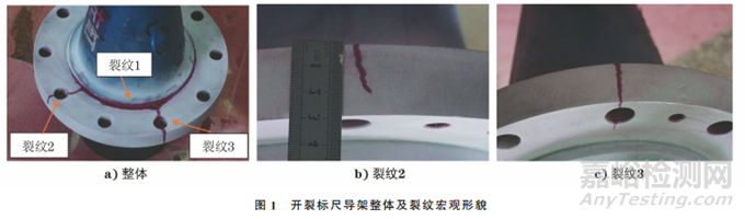 開裂標(biāo)尺導(dǎo)架整體及裂紋宏觀形貌如圖1所示。由圖1可知:標(biāo)尺導(dǎo)架手輪及法蘭的防護(hù)漆完好,活塞桿及活塞表面光亮且附有少量油漬,無明顯氧化、腐蝕、機(jī)械損傷等痕跡;連接法蘭上存在3條裂紋,裂紋1沿法蘭凸臺根部環(huán)向擴(kuò)展,裂紋無分叉,長度約為法蘭內(nèi)側(cè)周長的7/10;裂紋2和裂紋3由環(huán)向裂紋擴(kuò)展至螺栓孔,無分叉,由法蘭上部向下部擴(kuò)展,沿法蘭壁厚方向觀察,裂紋3已貫穿法蘭壁厚;根據(jù)裂紋布局、形態(tài)及擴(kuò)展方向可判斷,裂紋1為主裂紋,其開口最大處為啟裂部位,裂紋2、裂紋3為支裂紋,啟裂于法蘭頂面。