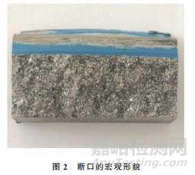 沿裂紋人工打開,對斷口進(jìn)行宏觀觀察,結(jié)果如圖2所示。由圖2可知:斷口表面粗糙,存在金屬顆粒,有起伏,斷裂面周邊無明顯塑性變形,呈脆性開裂特征。