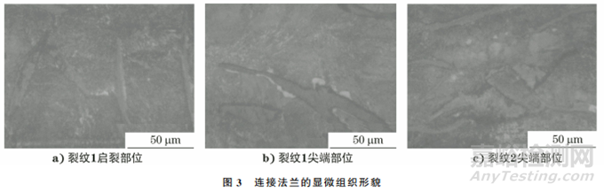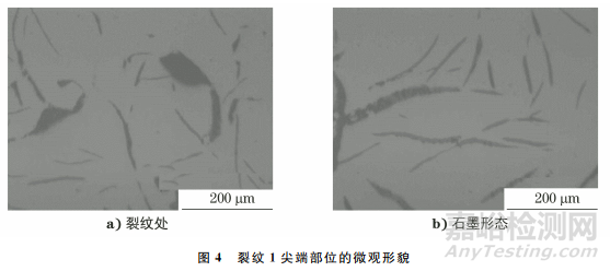 采用光學(xué)顯微鏡對裂紋1尖端部位進(jìn)行觀察,結(jié)果如圖4所示。由圖4可知:法蘭部位裂紋沿石墨片擴(kuò)展,裂紋無分叉,從尖端觀察,裂紋不連續(xù);石墨以片狀為主,少量石墨呈塊狀,并存在粗大石墨。經(jīng)測量,片狀石墨寬度約為2.5μm,粗大石墨寬度約為14μm,依據(jù)GB/T 7216—2009 《灰鑄鐵金相檢驗(yàn)》,判斷石墨長度級別為3級。