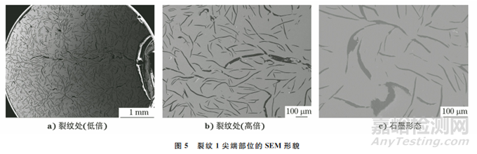采用掃描電鏡對裂紋1尖端部位進(jìn)行觀察,結(jié)果如圖5所示。由圖5可知:裂紋沿石墨片呈不連續(xù)擴(kuò)展形貌,試樣內(nèi)存在夾雜及孔洞等缺陷;試樣表面有較多寬度較大且不密實(shí)的石墨片,試樣邊緣及內(nèi)部存在沿石墨片方向分布的裂紋,經(jīng)測量,該類石墨片寬度均大于6μm。