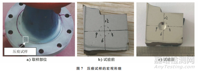 在裂紋1尖端部位的無裂紋處取樣,采用布氏硬度試驗(yàn)方法對試樣加載試驗(yàn)力,壓痕試樣的宏觀形貌如圖7所示。