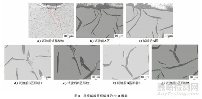 壓痕試樣取樣部位經(jīng)滲透檢測后并未發(fā)現(xiàn)裂紋,采用掃描電鏡對壓痕試驗(yàn)前后的試樣進(jìn)行觀察,結(jié)果如圖8所示。由圖8可知:試驗(yàn)前A區(qū)存在貫穿表面的裂紋,裂紋位于長度約為160μm的石墨片內(nèi),壓痕試驗(yàn)前后裂紋未發(fā)生擴(kuò)展;試驗(yàn)前B區(qū)存在未貫穿表面的埋藏型裂紋,長度約為550μm,裂紋沿石墨片擴(kuò)展。對比壓痕試驗(yàn)前后試樣的SEM形貌可知,尺寸較大的石墨片內(nèi)易出現(xiàn)裂紋,埋藏裂紋發(fā)生明顯擴(kuò)展。
