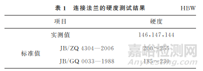 在連接法蘭表面無缺陷部位取樣,對試樣進(jìn)行硬度測試,結(jié)果如表1所示。由表1可知:試樣的硬度不滿足JB/ZQ 4340—2006 《耐磨鑄鐵》對Cu-Cr-Mo合金鑄鐵及JB/GQ 0033—1998《耐摩鑄鐵》對MTCrMoCu-250鋼的要求。