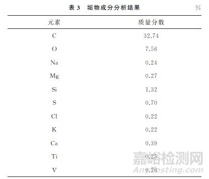 對裂紋3裂紋面附著垢物進(jìn)行化學(xué)成分分析,結(jié)果如表3所示。由表3可知:垢物中含有較多的C元素和O元素,經(jīng)分析C元素和O元素來源于使用或檢修過程中滲透進(jìn)裂紋內(nèi)的垢物。