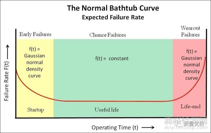 要注意的一點(diǎn)是:雖然指數(shù)分布是可靠性分析中最適用的,根據(jù)該分布,隨著時(shí)間的推移,故障率會(huì)趨于一個(gè)恒定值,見下圖“浴盆曲線”的中間部分。但是對(duì)于工業(yè)產(chǎn)品,其曲線不會(huì)這么規(guī)則,會(huì)有很多的變異的存在,不能完全生搬硬套。