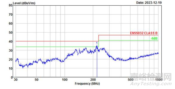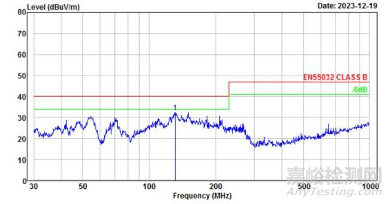 綠色代表余量6dB限值。測試曲線在綠色以下代表余量充足,數(shù)據(jù)合格。