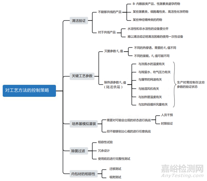 工藝方法方面主要會涉及到清潔驗(yàn)證和工藝控制參數(shù),同樣也可以用思維導(dǎo)圖進(jìn)行梳理,如圖 5 所示。有些國家明文規(guī)定需要采用獨(dú)立的空調(diào)系統(tǒng),那就不能夠用驗(yàn)證來說明可以共用空調(diào)系統(tǒng)。對于培養(yǎng)基模擬灌裝試驗(yàn)來說,需要模擬諸如人工干預(yù)等情況,但也不能夠夸張地來模擬試驗(yàn)一些不符合實(shí)際的動作和情形。