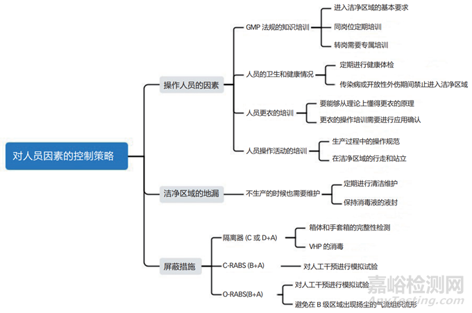 可以用如圖 1 所示的思維導(dǎo)圖來梳理一下人員方面造成產(chǎn)品污染的潛在因素,這樣就便于采取措施來應(yīng)對和化解風(fēng)險(xiǎn),乃至于達(dá)到提前消除風(fēng)險(xiǎn)的目標(biāo)。其中,屏蔽措施雖然講的是設(shè)備,但主要涉及到對人員的屏蔽,所以就將其安排在此處一并討論。