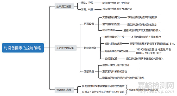 生產(chǎn)設(shè)備可以再細(xì)分為生產(chǎn)用的工器具、工藝生產(chǎn)設(shè)備和公用工程設(shè)備,同樣也可以用思維導(dǎo)圖來梳理一下其污染控制的策略(如圖 2 所示)。