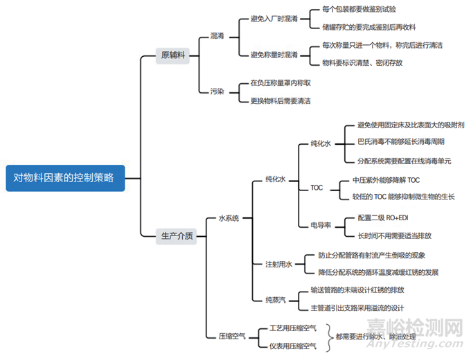 物料的污染控制需要從源頭開始。歷史上,在生產(chǎn)物料混淆方面曾發(fā)生過一起慘痛的事故:不法供應(yīng)商將二甘醇冒充藥用輔料丙二醇出售給制藥廠,致使假冒輔料投料用于生產(chǎn),制造出假藥“亮菌甲素注射液”并投入市場,最終釀成了極其嚴(yán)重的后果。所以在原輔料入廠的時(shí)候,必須嚴(yán)格把關(guān),對每件原輔料都做好鑒別。對物料方面的風(fēng)險(xiǎn)采用思維導(dǎo)圖梳理,如圖 3 所示。