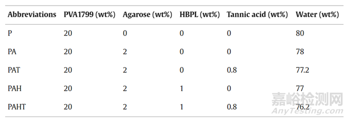 制備了五種類型的水凝膠敷料(表1)。以PAHT水凝膠為例,制備方法如下:在110 ℃下,機(jī)械攪拌下將20 wt% PVA1799和2 wt%瓊脂糖溶解在76.2 wt%水中;冷卻至90 ℃后,加入1 wt% HBPL(博慧(浙江)生物技術(shù)有限責(zé)任公司)和0.8 wt% TA,調(diào)節(jié)pH至6;完全溶解后,將溶液澆鑄到模具中,并冷卻至室溫,然后將其在-20 ℃下冷凍4小時,并在室溫下解凍1小時,此過程重復(fù)3次。其他水凝膠按照類似的過程制備。