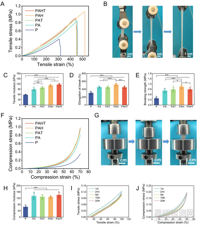 圖2 水凝膠的機(jī)械性能。(A)不同組分水凝膠的拉伸應(yīng)力-應(yīng)變曲線。(B)PAHT水凝膠拉伸試驗照片。(C)不同水凝膠的拉伸模量、(D)斷裂伸長率和(E)斷裂強(qiáng)度。(F)不同組分水凝膠的壓縮應(yīng)力-應(yīng)變曲線。(G)PAHT水凝膠壓縮試驗照片。(H)不同水凝膠的壓縮模量。PAHT水凝膠的循環(huán)拉伸(I)和壓縮(J)曲線。