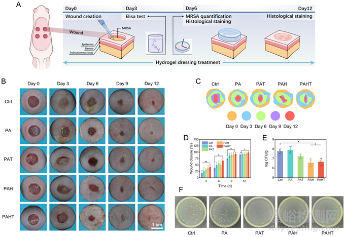 為評價PAHT水凝膠敷料治療體內(nèi)創(chuàng)面的效果,建立了MRSA感染的全層皮膚缺損大鼠模型(圖4A)。含HBPL的水凝膠抗感染能力十分突出,PAHT組愈合最快,12天時傷口幾乎完全閉合(圖4B-D)。從收集的傷口組織中分離出細(xì)菌,分析各組的體內(nèi)抗感染能力。與宏觀觀察結(jié)果一致,對照組和PA組的傷口中存在大量細(xì)菌,PAT組的細(xì)菌數(shù)量減少,而PAH和PAHT組的細(xì)菌含量最低(圖4E, F)。