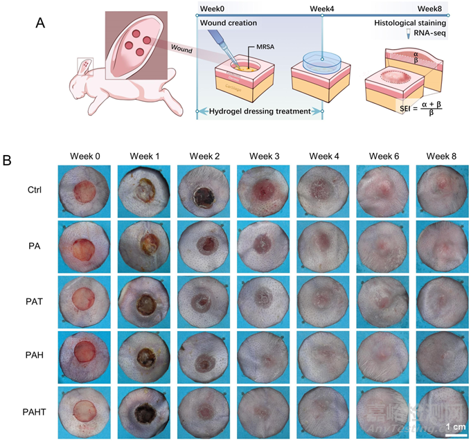 建立了兔耳增生性瘢痕模型(圖6A)。前4周的創(chuàng)面愈合階段與大鼠模型結(jié)果基本一致。在第4周結(jié)束時,在對照、PA和PAT組中觀察到明顯的紅色瘢痕。之后,瘢痕逐漸穩(wěn)定,隨著時間的延長顏色逐漸減退。在所有組中,PAH組和PAHT組的瘢痕外觀最接近正常皮膚(圖6B)。