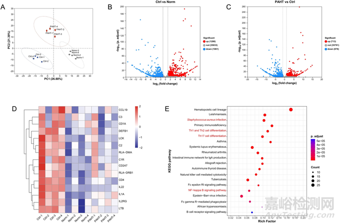 圖8 PAHT水凝膠抑制增生性瘢痕形成的機(jī)理分析。(A)正常組、對照組和PAHT三組的主成分分析。(B)對照組與正常組和(C)PAHT與對照組的差異基因火山圖。(D)差異基因熱圖。(E)對照組與正常組中上調(diào)、PAHT與對照組中下調(diào)交集基因的KEGG通路分析。