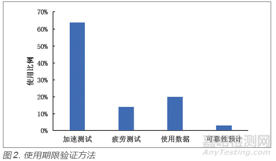 通過(guò)對(duì)使用期限研究資料匯總分析,申請(qǐng)人在開(kāi)展使用期限驗(yàn)證時(shí)最常用的方法是加速測(cè)試,如圖2 所示在所有注冊(cè)件中占比約為64%。也有申請(qǐng)人使用其他驗(yàn)證方法,但使用頻次較低,如使用數(shù)據(jù)(20%)、疲勞測(cè)試(14%)、可靠性預(yù)計(jì)(3%)。申請(qǐng)人在進(jìn)行加速試驗(yàn)時(shí)一般會(huì)考慮預(yù)期使用環(huán)境和使用狀態(tài)并結(jié)合加速模型來(lái)計(jì)算加速因子,常用的加速模型有阿累尼烏斯模型和逆冪模型,64%的加速試驗(yàn)通過(guò)二者相結(jié)合使用,前者單獨(dú)使用時(shí)通常用來(lái)驗(yàn)證器械的無(wú)菌貨架效期。