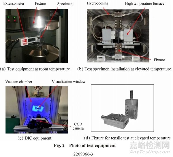 圖 2 給出了室溫與高溫環(huán)境下二維編織 SiC/SiC復合材料拉伸試驗的試驗過程及所用設備。如圖 2(a)所示,室溫環(huán)境下采用電液伺服試驗機進行加載,在試驗件標距段安裝引伸計采集變形數(shù)據(jù)。如圖 2(b)所示,在高溫拉伸試驗中,本文采用了惰性氣體環(huán)境箱內(nèi)置高溫爐的方式來提供指定溫度下的無氧試驗環(huán)境。環(huán)境箱通過氣體管路連接真空泵和惰性氣體氣源。通過真空泵多次抽真空以去除環(huán)境箱內(nèi)的氧氣,惰性氣體氣源用于維持環(huán)境性內(nèi)的無氧環(huán)境并保持內(nèi)外壓差。高溫爐內(nèi)裝有多個溫度傳感器用于監(jiān)測試件表面溫度。本文采用非接觸式的數(shù)字圖像相關技術來采集試件在高溫拉伸過程中的變形數(shù)據(jù)。如圖 2(c)所示,DIC 技術所用設備主要包括CCD 相機、支撐支架、外部燈光和透視觀察窗。當高溫爐內(nèi)試件表面溫度上升至 800 ℃以上,試件周圍由于熱輻射作用會呈現(xiàn)為紅亮狀態(tài)。為了消除熱輻射的影響,本文在 CCD 相機鏡頭前添加了固定波長濾波片,采用藍光燈代替 LED 等對試件表面進行光亮補償。試驗均采用位移控制方式,加載速率為0.2 mm/min。