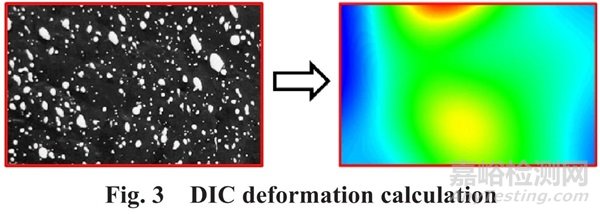 試驗完成后,使用 DIC 后處理軟件對采集到的試件圖像進行處理。如圖 3 所示,框選圖像中試件表面散斑區(qū)域,選區(qū)大小橫向?qū)挾葢恍∮?2/3 的試件標距段寬度。根據(jù)選區(qū)內(nèi)部白色散斑的變化情況,計算得到云圖所示的試件變形分布。對云圖數(shù)據(jù)進行提取即可得到試件的變形與應變數(shù)據(jù)。使用掃描電子顯微鏡對試驗件斷口進行觀察,分析材斷口形貌的差異以及溫度對材料拉伸性能的影響。