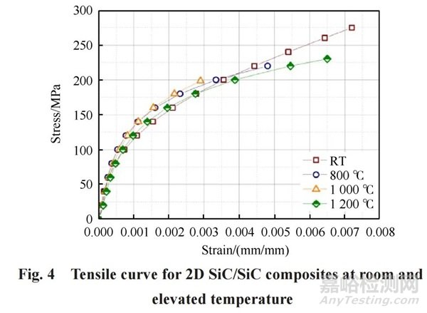 圖 4 給出了室溫、800 ℃,1 000 ℃,1 200 ℃四種環(huán)境溫度下測試得到的二維編織 SiC/SiC 復合材料的拉伸應力-應變曲線。從圖中可以看出,所有測試溫度下材料的拉伸應力-應變曲線變化趨勢基本一致,均表現(xiàn)出明顯的雙線性特征??梢钥闯?,高溫環(huán)境下二維編織SiC/SiC復合材料的拉伸強度明顯低于室溫環(huán)境的測試結(jié)果。初始線性段材料彈性模量在室溫環(huán)境與高溫環(huán)境下基本一致。高溫環(huán)境下材料第二線性段彈性模量要比室溫環(huán)境小,表明材料在高溫環(huán)境下具有更高的韌性。