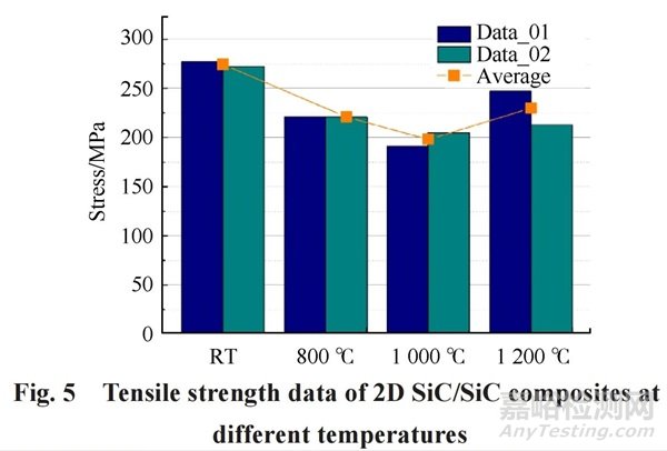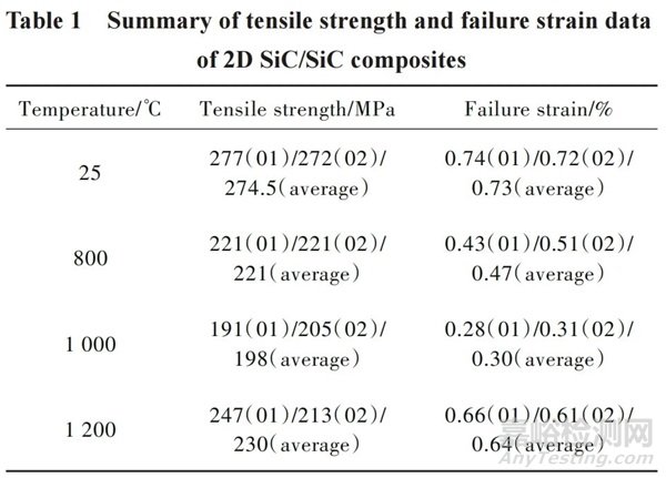 表1 給出了從拉伸應力-應變曲線中提取得到的不同測試溫度下二維編織SiC/SiC復合材料的拉伸強度和失效應變數(shù)據(jù)的匯總結(jié)果。表中包含了各個測試溫度下兩條曲線各自的數(shù)據(jù)和兩者的平均值。