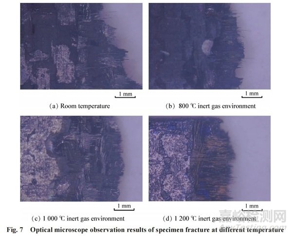 圖 7 給出了在光學顯微鏡下觀察到的不同測試溫度下試件的斷口形貌。對比圖中結(jié)果可以看出,室溫環(huán)境下斷口處相鄰鋪層的破壞位置差異較大,同一鋪層內(nèi)沿加載方向的破壞位置也不一致,斷口參差不齊。相比之下高溫環(huán)境的斷口更為平整,表明高溫環(huán)境下二維編織 SiC/SiC 復合材料內(nèi)部力學性能更為均勻。從圖中還可以看出,試驗溫度越高,斷口纖維拔出數(shù)量和長度越大。造成這一現(xiàn)象的可能原因是隨著溫度的升高,纖維與基體之間的結(jié)合強度會減弱。