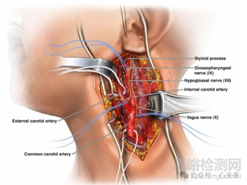 CEA 是治療頸動(dòng)脈狹窄的“金標(biāo)準(zhǔn)”。醫(yī)生會(huì)在頸部開(kāi)一個(gè)較大的(10-15cm)縱向手術(shù)切口,顯示頸內(nèi)、頸外的分叉以及頸總動(dòng)脈,期間需要避免損傷包繞周?chē)娘B神經(jīng),一旦損傷這些顱神經(jīng),有可能會(huì)影響患者的說(shuō)話(huà)、吞咽、面部感覺(jué)、味覺(jué)、唾液分泌等,讓患者出現(xiàn)短暫或者長(zhǎng)期影響生活的卒中樣癥狀。