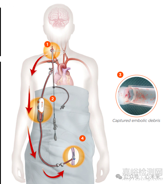 ENROUTE® Transcarotid Neuroprotection System 通過(guò)逆轉(zhuǎn)血液流出大腦,防止血栓碎片在頸動(dòng)脈血運(yùn)重建過(guò)程中流向大腦。流量控制器中的過(guò)濾器會(huì)收集大小碎片,過(guò)濾后的血液通過(guò)股靜脈中的護(hù)套返回。