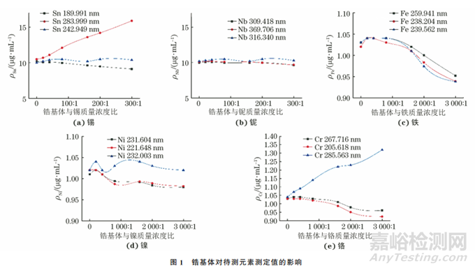 鋯在339.198,343.823,257.139nm等波長處靈敏度高,響應(yīng)強(qiáng)度大,應(yīng)避免在上述波長附近選擇待測元素的分析譜線。選取錫常用的3條分析譜線Sn189.991,283.999,242.949nm,鈮常用的3 條分析譜線 Nb309.418,369.706,316.340nm,鐵常用的3條分析譜線 Fe259.941,238.204,239.562nm,鎳常用的3條分析譜線 Ni231.604,221.648,232.003nm,鉻常用的3條分析譜線 Cr267.716,205.618,285.563nm,考察了鋯基體與錫、鈮質(zhì)量濃度比分別為0∶1,20∶1,40∶1,80∶1,160∶1,200∶1,300∶1,與鐵、鎳、鉻質(zhì)量濃度比分別為0∶1,200∶1,400∶1,800∶1,1600∶1,2000∶1,3000∶1時對各待測元素測定值的影響,結(jié)果見圖1。