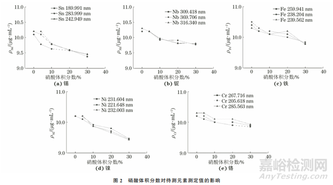 分析實(shí)際樣品時加入酸進(jìn)行溶解,因此建立工作曲線需要考慮酸量匹配的問題。試驗(yàn)考察了硝酸體積分?jǐn)?shù)分別為 0,4%,10%,20%,30%時對各待測元素測定值的影響,結(jié)果見圖2。