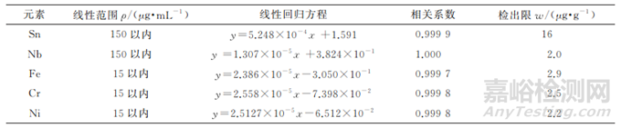 結(jié)果表明,在考察的質(zhì)量濃度比范圍內(nèi)Sn242.949nm、Sn189.991nm、Nb309.418nm、Nb369.706nm、Nb316.340nm、Ni221.648nm等分析譜線受鋯基體影響較小,而鐵、鉻在各自分析譜線下的測定值隨鋯基體含量變化影響較大。為避免基質(zhì)效應(yīng)的干擾,實(shí)現(xiàn)5種元素含量的同時測定,試驗(yàn)選擇基質(zhì)匹配法定量,并以Sn242.949 nm、Nb309.418nm、Fe259.941nm、Cr267.716nm、Ni221.648nm等5條分析譜線進(jìn)行測定。
