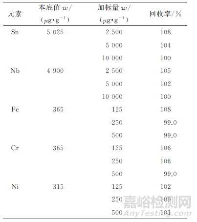 稱取3份0.1g樣品,分別加入3個濃度水平的錫、鈮、鐵、鉻、鎳單標(biāo)準(zhǔn)溶液,按照試驗(yàn)方法進(jìn)行測定,計(jì)算回收率,結(jié)果見表3。