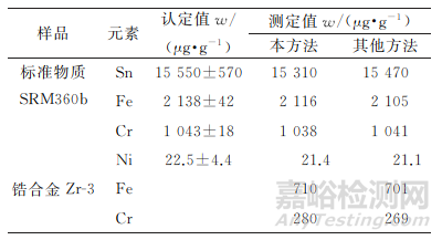 按照試驗(yàn)方法對鋯合金標(biāo)準(zhǔn)物質(zhì) SRM360b及市購鋯合金 Zr-3(部分元素)進(jìn)行分析,并與分光光度法(鐵、鉻、鎳)或化學(xué)滴定法(錫)測定結(jié)果進(jìn)行比對,結(jié)果見表4。