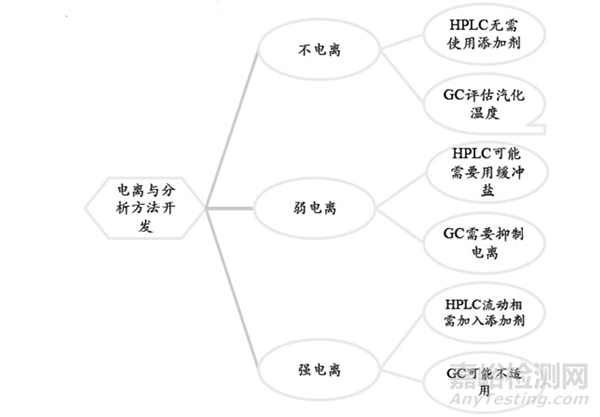 那么我們應(yīng)該通過這些結(jié)構(gòu)哪些特征去選擇相應(yīng)的分析方法呢?這里不得不提到一個(gè)大家都非常熟悉的詞語——電離。電離與分析方法之間的關(guān)系如圖所示。