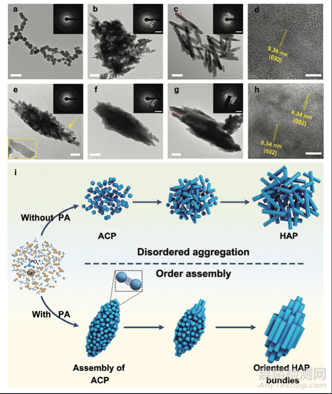 通過原位透射電鏡(TEM)觀察,監(jiān)測m-SBF中磷酸鈣從無定形到結(jié)晶的演變過程。在沒有PA分子的情況下,最初形成的ACP粒子直徑為34.5±6.7nm,并通過各種粒子間作用力相互隨機作用,形成無序聚集體。隨著結(jié)晶進行,這些顆粒從無定形狀態(tài)轉(zhuǎn)變?yōu)榻Y(jié)晶度較低的固體,最終形成棒狀HAP晶體,但這些HAP棒無法形成有序結(jié)構(gòu)。當PA分子引入m-SBF時,PA分子與ACP顆粒相互作用,改變其表面的物理化學性質(zhì),并調(diào)整顆粒間電位。在鈣離子存在情況下,PA可自組裝成納米片。隨著保形取向結(jié)晶的發(fā)生,聚集體的結(jié)晶度越來越高,形成緊密排列且相互平行的HAP晶體。此外,一些殘留PA分子可吸附在HAP表面,作為粘合劑改善桿狀HAP的結(jié)合。為進一步驗證PA分子在這一過程中的關(guān)鍵作用,利用傅立葉變換紅外光譜(FTIR)對PA和ACP之間的相互作用進行了研究,結(jié)果表明,PA和ACP之間存在相互作用,可能是通過PA的羧基和鈣離子之間的電子靜電相互作用發(fā)生的,ACP聚集體的組裝和晶化過程的可能情況見示意圖(圖2i)。在HAP成核和生長過程中,PA可以通過選擇性吸附來參與和控制這一結(jié)晶過程,從而影響最終形態(tài)。在PA的介導下,ACP通過溶解-重結(jié)晶或結(jié)構(gòu)重排途徑完全轉(zhuǎn)化為HAP,并形成組織良好、緊密的HAP束。以上結(jié)果表明了PA在調(diào)節(jié)具有排列整齊結(jié)構(gòu)礦物形成過程中的多重作用,可能會延伸到釉質(zhì)再生的應用中。