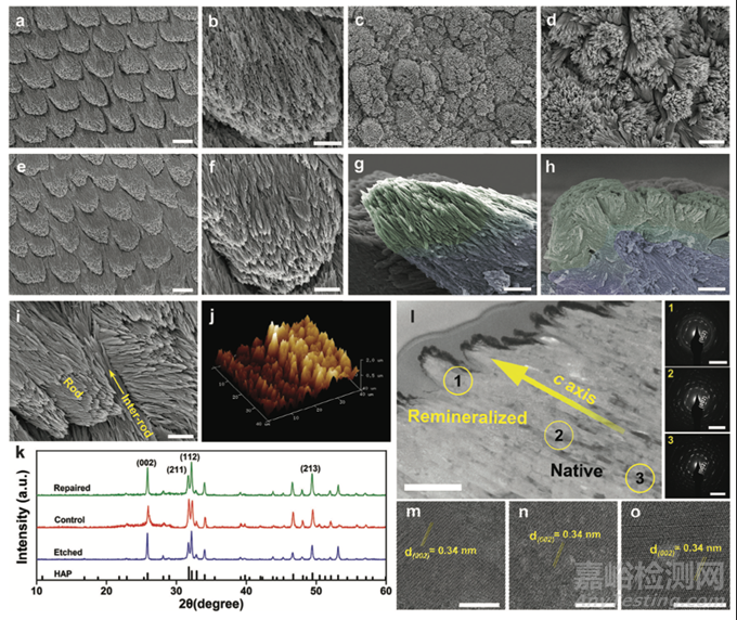 最初釉質(zhì)中的HAP晶體呈帶狀緊密結(jié)合在一起,酸蝕后表面礦物溶解,緊密結(jié)合的HAP晶體變得不緊密,削弱機械強度。通常情況下,琺瑯質(zhì)可以在m-SBF中再礦化,但新形成的HAP晶體取向與天然琺瑯質(zhì)不一致,結(jié)構(gòu)紊亂。在礦化系統(tǒng)中引入PA分子后,經(jīng)過3天的再礦化,結(jié)構(gòu)得以重建,由于形態(tài)結(jié)構(gòu)高度相似,掃描電鏡下與天然琺瑯質(zhì)無異,而且新形成的HAP晶體緊密堆積,比酸蝕形成的結(jié)構(gòu)更致密,縱向排列的釉棒和整個釉質(zhì)也可以再礦化,形成具有組織結(jié)構(gòu)的礦物層。再礦化琺瑯質(zhì)的橫截面顯示其內(nèi)部詳細結(jié)構(gòu),HAP晶體平行于琺瑯質(zhì)桿長軸,形成一個結(jié)構(gòu)上連續(xù)的層,再礦化和原生區(qū)之間沒有邊界。為進一步評估再礦化層的厚度,使用原子力顯微鏡(AFM)和光學輪廓儀,結(jié)果顯示再礦化區(qū)域和未礦化區(qū)域的高度差約為1.5μm,與掃描電鏡的結(jié)果一致。使用X射線衍射和HRTEM測量再礦化琺瑯質(zhì)層中的礦物相和微觀結(jié)構(gòu)。結(jié)果顯示實驗組新形成礦物的所有峰值和強度(I)與天然琺瑯幾乎相同,表明它們的宏觀晶體排列相似。新形成的HAP晶體在天然琺瑯質(zhì)晶體頂部外延生長,并以相同方位結(jié)束,從單個琺瑯質(zhì)棒的晶格條紋連續(xù)性證實從原生到再礦化區(qū)域的整合。綜上所述,以上結(jié)果證實PA分子在琺瑯質(zhì)再礦化中的重要作用,其結(jié)構(gòu)可以從納米尺度到宏觀尺度精確重建,顯示了其在未來實際應用中的潛力。