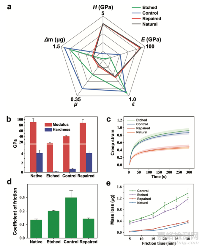 人牙齒琺瑯質(zhì)是一種具有層次結(jié)構(gòu)的生物功能復合材料,其性能恢復在受損后至關(guān)重要。本研究中,研究人員采用納米壓痕法測量琺瑯質(zhì)樣本的硬度(H)、彈性模量(E)、蠕變特性和耐磨性,全面評估了琺瑯質(zhì)樣本的力學性能?,m瑯質(zhì)可以作為模板誘導磷酸鈣在m-SBF中異質(zhì)成核并形成新的礦物層,但是結(jié)構(gòu)較為紊亂。相比之下,在PA參與下,琺瑯質(zhì)的H值和E值得以恢復,主要由于形成了與天然琺瑯質(zhì)類似的組織結(jié)構(gòu)。此外,利用納米壓痕法以一步加載和卸載測試琺瑯的蠕變特性,PA誘導的釉質(zhì)再礦化蠕變特性得以改善,抗疲勞性也得到提高,表明其具有相似的耐磨性,而且都更優(yōu)越。但是,酸蝕樣品的這些值由于酸蝕處理破壞了表面結(jié)構(gòu)而有所下降,對照組的再礦化性能較差,很難提高其性能。與對照組相比,PA誘導的釉質(zhì)再礦化可提高釉質(zhì)的耐酸性。總之,以上結(jié)果表明,本文修復策略具有優(yōu)異的性能,在臨床實踐中大有可為。