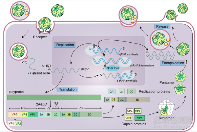 手足口病是由人類腸道病毒(EVs)引起的,EVs是小核糖核酸病毒科腸道病毒屬的成員。EVs的病毒顆粒是對稱的二十面體,由60個外殼蛋白亞基和一個正極性的單鏈RNA組成。病毒基因組的開放閱讀框(ORF)編碼2194個氨基酸,3′非翻譯區(qū)UTR(3′UTR)后面是可變長度的Poly-A尾部。病毒基因組編碼的蛋白質主要包括三個區(qū)域:P1、P2和P3,其中P1編碼四種結構蛋白VP1-VP4,P2和P3分別編碼七種非結構蛋白2A-2C和3A-3D。VP1-VP4進一步參與病毒粒子衣殼組裝。盡管VP1、VP2和VP3排列在衣殼的外側,但VP1是主要的抗原結合位點。因此,VP1是主要血清學分型和疫苗開發(fā)的合適候選者,并已被廣泛用作EVs分子研究的靶基因。