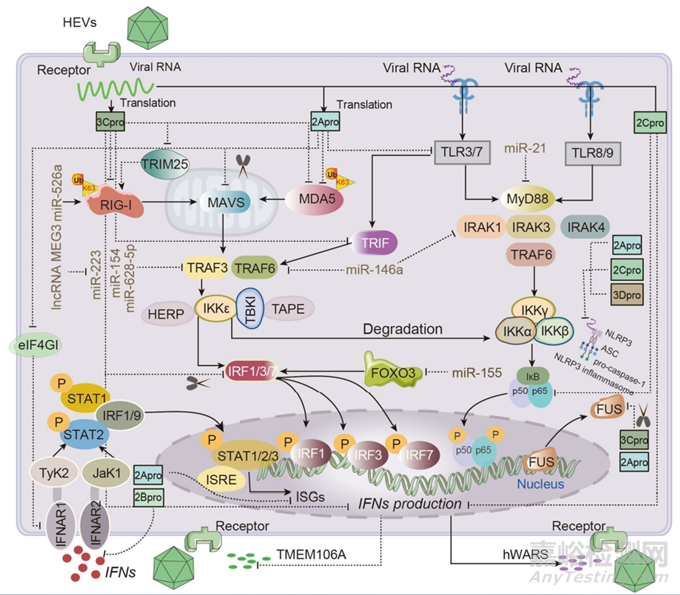 EVs已經進化出各種策略來抑制由IFNs介導的抗病毒反應。2Apro和3Cpro直接抑制IFNs的產生和IFNs受體的表達。EVs主要作用于PRR信號通路中的多種蛋白質分子,以完成免疫逃避。EVs主要通過控制宿主非編碼RNA(ncRNA)的水平來抑制TLR依賴性信號傳導,從而間接影響TLR感知宿主細胞的能力,以及切割下游分子MyD88和TRIF以阻止IFNs的產生。EVs除了參與常見的先天免疫信號通路外,還直接抑制抗病毒蛋白分子,如ZAP和?;o酶A氧化酶1(ACOX1)。它們還間接靶向泛素化的關鍵蛋白,如Ubc6e,以誘導細胞凋亡和自噬,最終加劇病毒感染。
