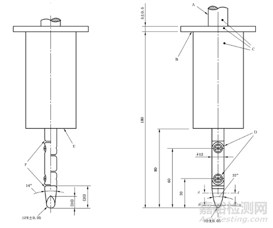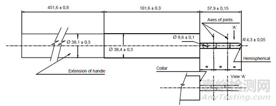 4. 手指和手臂試具不應(yīng)進入切割器件組件的軌跡,使用該試具沿著機器外圍和底部插向切割器件,確認手指和手臂試具是否有接觸到切割器件組件,手指和手臂試具規(guī)格和尺寸詳見下圖: