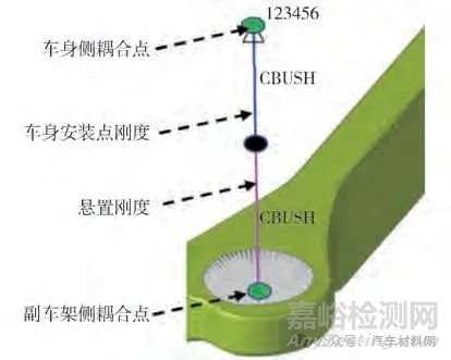 副車架作為電動汽車多級隔振的重要一級,概念設(shè)計各硬點及名稱如圖1 所示,其與車身往往通過懸置柔性連接。以圖2 所示的副車架前、后懸置點為例闡述柔性連接建模方法:創(chuàng)建兩個串聯(lián)的零長度CBUSH 單元,一個用于模擬車身安裝點剛度,另一個用于模擬副車架懸置剛度,并約束車身端耦合點1~6 自由度。為便于編程,前上控制臂簡寫為FUCA,前下控制板簡寫為FLCA,后上控制臂簡寫為RUCA,后下控制臂簡寫為RLCA,前束臂簡寫為SCA。
