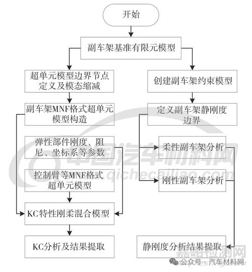 本文建立融合多學(xué)科工況的仿真流程,見圖3?;谕挥邢拊P徒Y(jié)構(gòu)參數(shù),打通靜剛度性能與運動學(xué)K&C 性能兩個學(xué)科之間的關(guān)聯(lián)關(guān)系。將尚未建立車身柔性連接的副車架作為基準(zhǔn)有限元模型(參考圖1),對副車架與車身的連接進行等效,建立副車架約束模型,進行靜剛度分析;將副車架基準(zhǔn)有限元模型、各控制臂有限元模型轉(zhuǎn)化為超單元模型,進一步地,基于超單元模型建立高精度K&C 模型并進行仿真分析??梢詫崿F(xiàn)副車架靜剛度分析、超單元模型縮減分析、K&C 性能分析3 種工況的并行仿真分析,并能自驅(qū)動多樣本迭代計算。