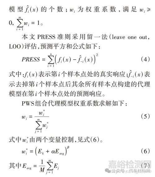 單一代理模型無法對所有優(yōu)化問題都有較強的預(yù)測能力[12],而組合代理模型具有更穩(wěn)定的近似能力[13]。一般而言,預(yù)測精度越高對應(yīng)的單一代理模型權(quán)系數(shù)越大,本文選取精度較高的單一代理模型參與組合代理模型構(gòu)造,利用預(yù)測平方和(prediction sum of squares,PRESS)誤差評價準(zhǔn)則計算權(quán)重系數(shù),建立PWS 組合代理模型(PRESS weighted surrogate, PWS):