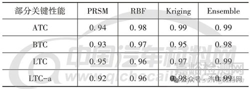 代理模型常用來逼近設(shè)計變量與性能指標(biāo)之間的真實映射關(guān)系,而本文研究的重點是靜剛度性能與K&C 性能之間的關(guān)系,進一步對表1 的實驗設(shè)計矩陣進行轉(zhuǎn)換,將靜剛度性能指標(biāo)轉(zhuǎn)換為設(shè)計變量,K&C 性能作為性能指標(biāo)。根據(jù)全局誤差評估指標(biāo)R2(R2 越接近1 精度越高),從12 種常用代理模型中選出精度較大的PRSM、RBF、Kriging 模型構(gòu)造組合代理模型Ensemble。精度對比結(jié)果見表2(其中LTC、LTC-a 分別為側(cè)向力、反側(cè)向力柔度),組合代理模型綜合近似能力相對更優(yōu)。
